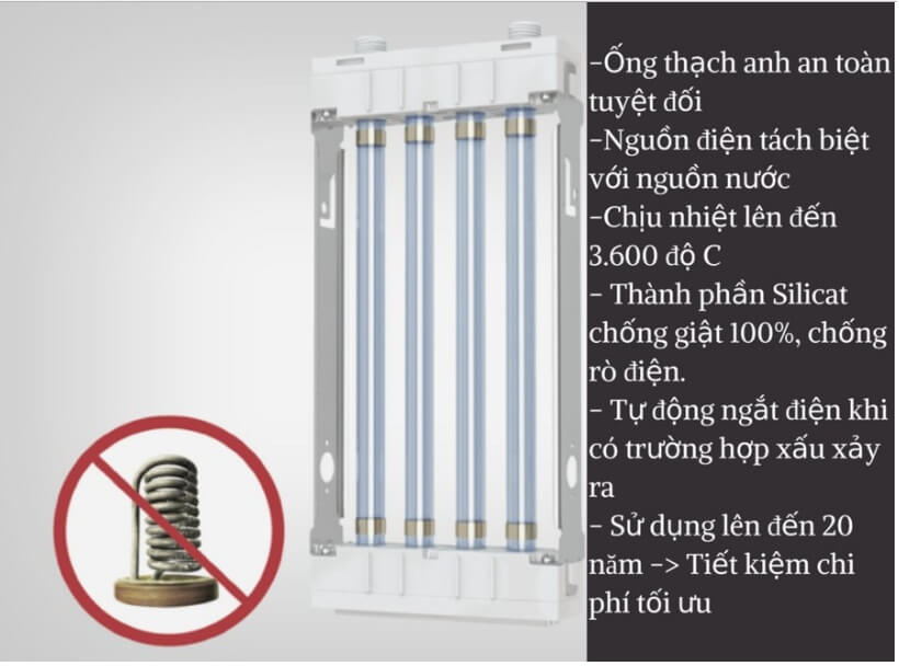 - Ống thạch anh siêu bền, Tiết kiệm 60% điện so với công nghệ cũ: Ống thạch anh được tráng Nano Carbon siêu bền, chống bám cặn, hạn chế được khả năng bộ phận gia nhiệt bị ăn mòn, tránh tiêu hao điện. tạo sự cách ly với điện mang lại sự an toàn