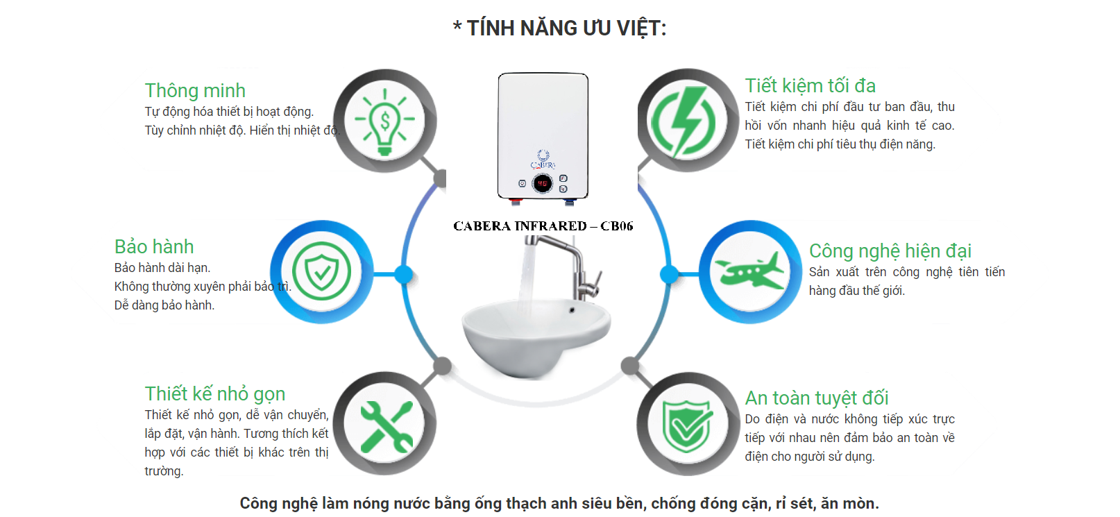 Công nghệ năng lượng mặt trời là giải pháp năng lượng sạch của tương lai. Còn công nghệ máy nước nóng hồng ngoại 2017 là công nghệ làm nóng nước tiên tiến của Hoa Kỳ, nước được làm nóng trực tiếp bằng tia hồng ngoại, hoàn toàn không có sự tiếp xúc trực tiếp giữa nước và điện nên tuyệt đối an toàn.